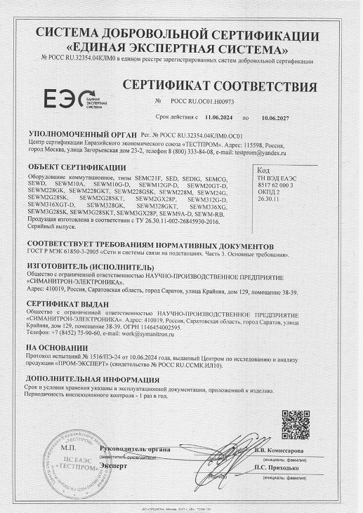 Сертификат ТБ-969 коммутатора SEWM54G-6XG-24GT-24GSFP-HI-HI-Cf