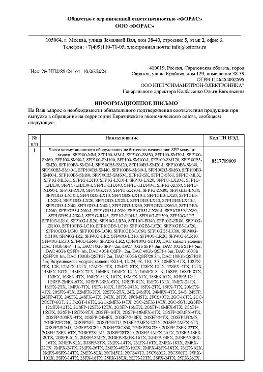 Отказное письмо на SFP модули